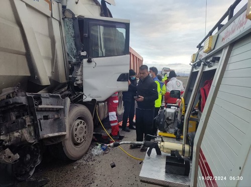 امدادرسانی نجاتگران پایگاه شهید اصغری به حادثه برخورد خودرو تریلی با تریلی درمحور نیشابور به سبزوار